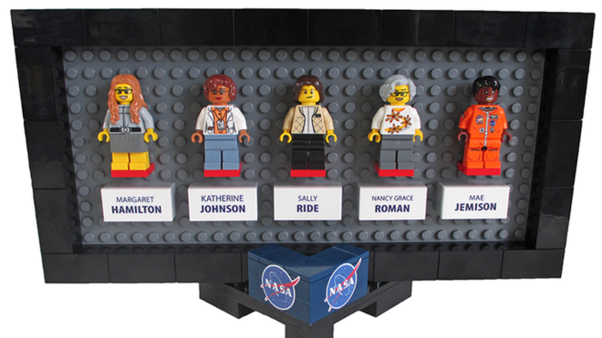 Women honored with a figure: Scientist, Margaret Hamilton; astronaut, physicist and educator, Sally Ride; astronomer, Nancy Grace Roman; and astronaut and physician, Mae Jemison.