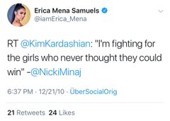 Naturally, The Barbz took the statement into their own hands and did some digging that proves Erica may have told some lies. Old tweets from Erica's Twitter feed prove that she actually was a fan of Nicki at one time. The Love & Hip Hop New York star once tweeted Nicki's lyrics and even tweeted at Nicki, dissing Lil Kim at the same time.